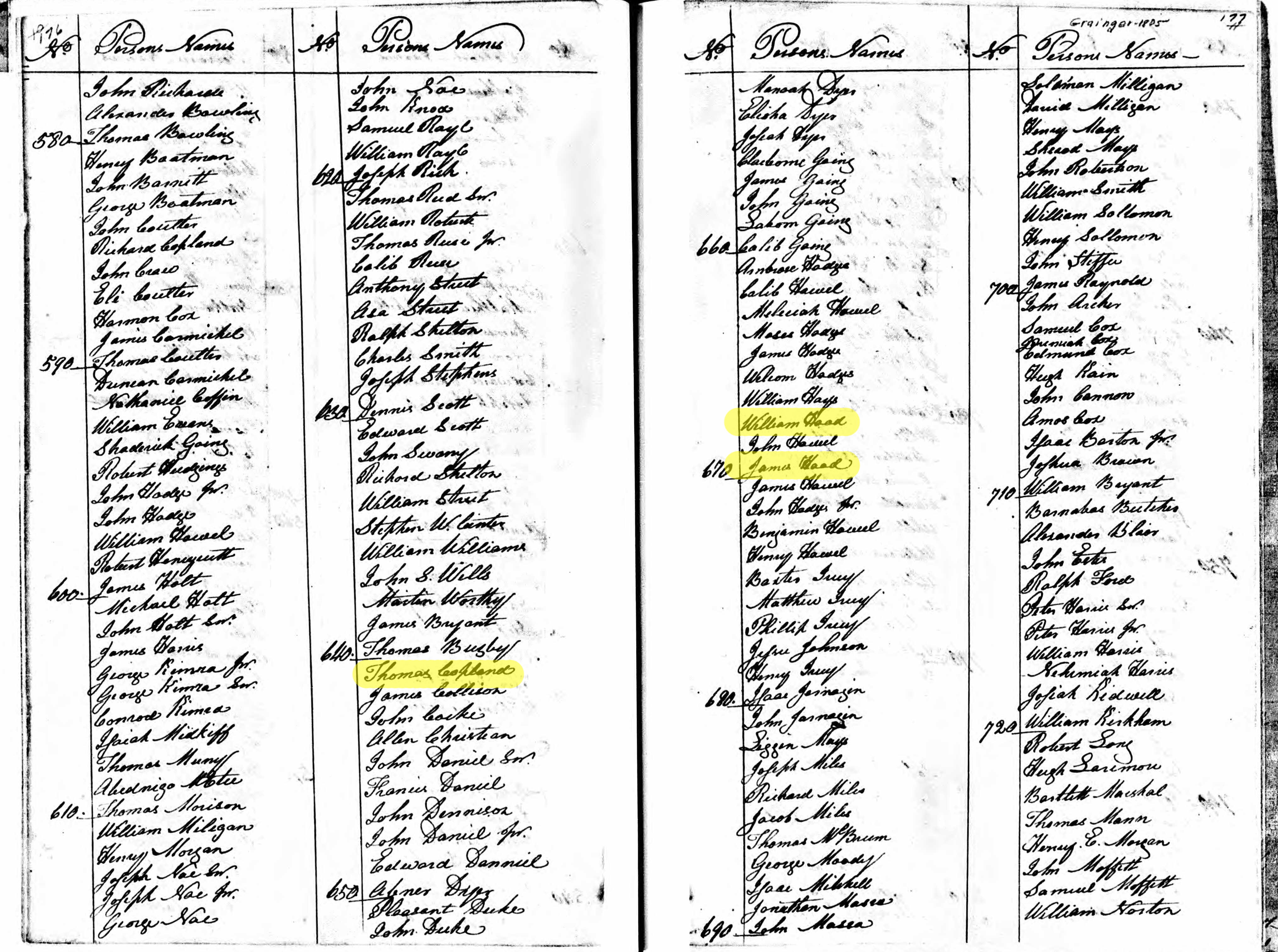 1805 Grainger County Tax List. Highlighted are Thomas Copeland, William Hood, and James Hood (Edmund Fears appears on another page). Click image to see a larger version.