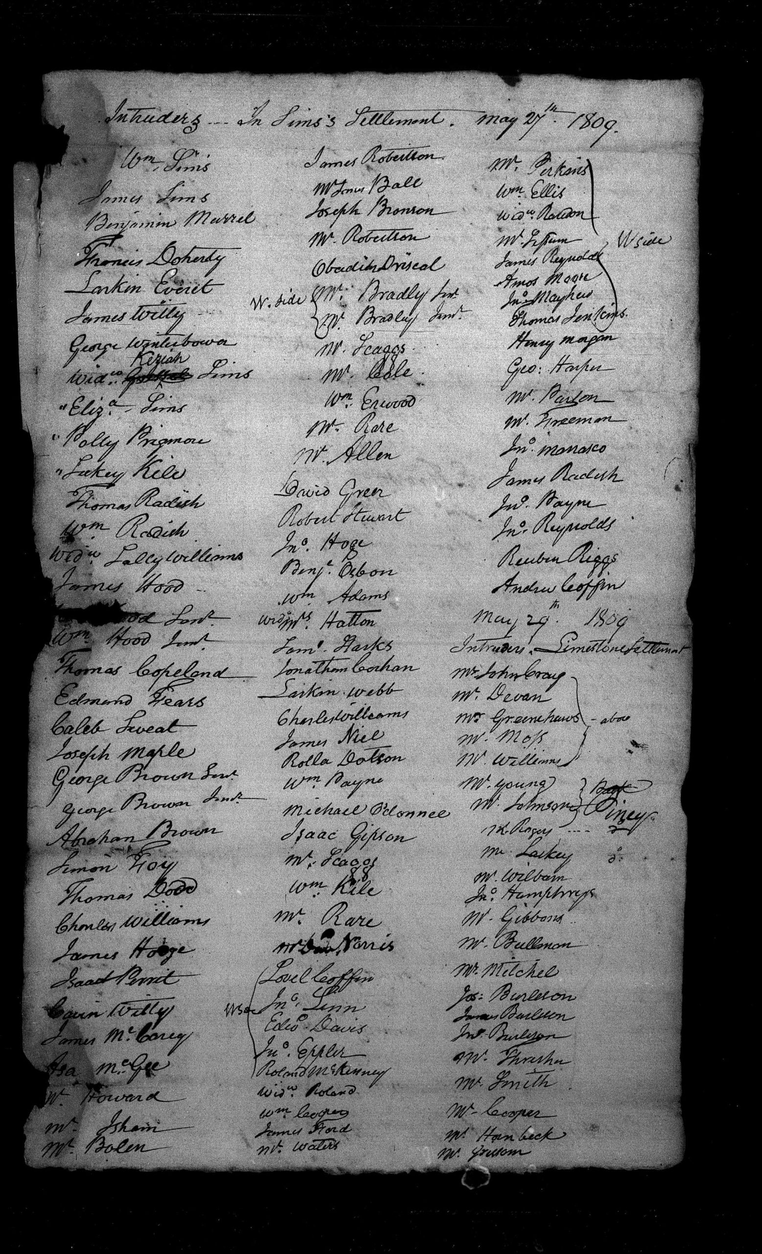 The names of our ancestors can be found on both the intruders list and the petition. The following ancestors are listed as intruders on a list dated 27 May 1809: Thomas Copeland; William Hood, Sr.; William Hood, Jr.; James Hood; and Edmund Fears. They are all listed next to one another, and their close proximity to the founders of the settlement, William and James Sims, indicates that they were most likely among the original settlers. The Sims men were also from Grainger County in Tennessee, so it’s possible that our ancestors traveled along with them in the fall of 1806, as is described above.